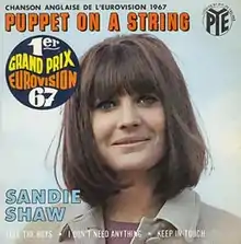 "Puppet on a String" is a song recorded by British singer Sandie Shaw. The song, written by Bill Martin and Phil Coulter, was selected to be the United Kingdom's entry at the Eurovision Song Contest 1967, held in Vienna. Shaw won the contest, the first of the United Kingdom's five Eurovision winners.[4][5] As her thirteenth UK single release, "Puppet on a String" became a UK Singles Chart number one hit on 27 April 1967, staying at the top for a total of three weeks.[6] In the United States, a 1967 version by Al Hirt went to number 18 on the Adult Contemporary chart and No. 129 on the Billboard Hot 100.[7]