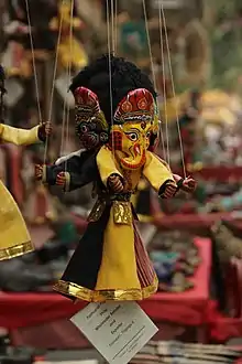 Shadow puppets are an ancient part of India's culture and art, particularly regionally as the keelu bomme and Tholu bommalata of Andhra Pradesh, the Togalu gombeyaata in Karnataka, the charma bahuli natya in Maharashtra, the Ravana chhaya in Odisha, the Tholpavakoothu in Kerala and the thol bommalatta in Tamil Nadu. Shadow puppet play is also found in pictorial traditions in India, such as temple mural painting, loose-leaf folio paintings, and the narrative paintings.[19] Dance forms such as the Chhau of Odisha literally mean "shadow".[20] The shadow theatre dance drama theatre are usually performed on platform stages attached to Hindu temples, and in some regions these are called Koothu Madams or Koothambalams.[21] In many regions, the puppet drama play is performed by itinerant artist families on temporary stages during major temple festivals.[22] Legends from the Hindu epics Ramayana and the Mahabharata dominate their repertoire.[22] However, the details and the stories vary regionally.[23][24]