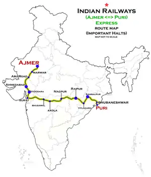 The 18421 / 18422 Puri - Ajmer Express is an express train belonging to Indian Railways East Coast Railway zone that run between Puri and Ajmer Junction in India.[1]