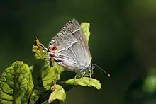 Z. quercus L. (74 c, d). male above with a blue gloss and narrow black distal border, the female with the basal area of the forewing blue and often the cell of the hindwing bluish. Underside leaden-grey, with a proximally dark-edged white line before the outer third and in the anal area of the hindwing weak yellow spots. ab. obsoleta Tutt are females without any blue gloss; there occur also transitional specimens with the blue reduced (semiobsoleta). ab. pallescens Tutt are males with a pale grey greenish instead of blue gloss. In ab. excessus Tutt the hindmargin of the forewing bears a coppery streak. Courvoisier proposes the name ab. latefasciata for specimens with broader white line on the underside, ab. bellus Gerh. (74 d) are females with small orange spots at the apex of the cell of the forewing, which are reduced to two spots in ab. bipunctatus Tutt and to one in ab. unipunctus Tutt. Widely distributed, occurring throughout Europe and Asia Minor from England and the Atlantic coast to Armenia and from North Europe to the Mediterranean — Beyond the Mediterranean Sea and on the Iberian Peninsula there occurs iberica Stgr. (74 d).Larger, above very dark, the blue area of the male very sharply defined but not very extended. Underside paler silvery grey, the whitish line therefore being less prominent. — Egg semiglobular, whitish grey, granulose. The larva, which is already developed in the summer, does not leave the egg before April; it bores into the young shoots and later lies on the young leaves, especially on those of the lower twigs of old oak-trees. It is a dreadful cannibal and is evidently avoided by insect-eating birds, as it has been found unmolested in the nest of the blue tit containing young birds (Bingham-Newland). On the other hand it is much infested with ichneumons, as well as a species of Tachina, which develops after the pupation of the caterpillar (Steinfert). Adult yellowish brown with a reddish tint, on the back a row of triangles connected by a dark line, the sides greenish. On various species of oak, and said to occur also on other plants (Myrica, etc.); adult in July. The pupa rounded, brown, irregularly spotted with blackish, on the back three rows of dark spots. The butterflies occur from June till August everywhere in the plains and hills, but usually singly, in certain years more plentifully. They rest on the outer twigs of oak-bushes with the wings always closed, but sometimes flutter high up about the crowns of old oaks.[4]
