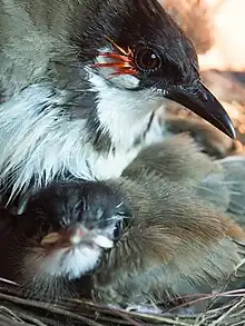 The breeding season is spread out and peaks from December to May in southern India and March to October in northern India.[29] Breeding may occur once or twice a year.[30] The courtship display of the male involves head bowing, spreading the tail and drooping wings.[30] The nest is cup-shaped, and is built on bushes, thatched walls or small trees. It is woven of fine twigs, roots, and grasses, and embellished with large objects such as bark strips, paper, or plastic bags.[23] Clutches typically contain two or three eggs.[30] Adults (possibly the female[15]) may feign injury to distract potential predators away from the nest.[30][31] The eggs have a pale mauve ground colour with speckles becoming blotches towards the broad end. Eggs measure 21 mm and are 16 mm wide.[32] Eggs take 12 days to hatch. Both parents take part in raising the young. Young birds are fed on caterpillars and insects which are replaced by fruits and berries as they mature.[15] The chicks are psilopaedic (having down only in the pterylae).[14] Eggs and chicks may be preyed on by the greater coucal and crows.[15]