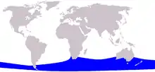 The pygmy right whale is among the least studied cetaceans; until 2008, fewer than 25 sightings of the species had been made at sea.[6] The species lives in the Southern Hemisphere and is believed to be circumpolar, living in a band from about 30°S to 55°S[3] in areas with surface water temperatures between 5 and 20 °C (41 and 68 °F).[19] Individuals have been found on the coasts of Chile,[23] Tierra del Fuego, Namibia, South Africa, Australia and New Zealand. One group may be a year-round resident off Tasmania.[19] The total population is unknown.