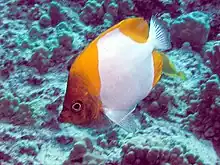 The rest of its body is white, peduncle and caudal fin included. Insertion of yellow-orange areas at the top of the side form a characteristic pyramidal pattern, hence the name of the fish.[5] The anal fin is also yellow-orange.[4]