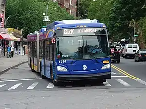 In spring 2013, 60-foot (18 m) articulated buses began replacing the standard 40-foot (12 m) buses on the route. The Q10 was the second route in Queens to receive articulated buses, after the Q44. At the time, the Q10 was the third busiest route in the city and its buses were frequently overcrowded.[36] The use of articulated buses received positive feedback from commuters, but opposition from some local residents and business owners to potential traffic issues and loss of parking spaces.[37][38] With the change to articulated buses, in April 2014, the frequency of service was slightly decreased.[39]