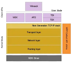 The Next Generation TCP/IP stack connects to NICs via a Network Driver Interface Specification (NDIS) driver. The network stack, implemented in tcpip.sys implements the Transport, Network and Data link layers of the TCP/IP model. The Transport layer includes implementations for TCP, UDP and unformatted RAW protocols. At the Network layer, IPv4 and IPv6 protocols are implemented in a dual-stack architecture. And the Data link layer (also called Framing layer) implements 802.3, 802.1, PPP, Loopback and tunnelling protocols. Each layer can accommodate Windows Filtering Platform (WFP) shims, which allows packets at that layer to be introspected and also host the WFP Callout API. The networking API is exposed via three components:[1]