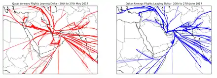 - ↑ "Flight Ban for Qatar Flights in UAE, Saudi Arabia, Bahrain, and Egypt". Flightradar24. 5 June 2017. Archived from the original on 27 November 2017. Retrieved 5 June 2017.