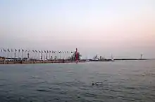 Access from the Qingdao Paralympic Village to the dock, work areas, etc. was provided by numerous golf carts making endless daytime rounds. Both ends of the work area had two cranes apiece, which could lift large keelboats like the Sonar from cradles and lower these into the water. At night, a laser light show from the main breakwater lighthouse would play from early evening to midnight. Facing the Yellow Sea, the main breakwater with spectator seating, windmills, flags and lighthouse was also the viewing area for the sailing competitions when not on the spectator ferry. Across the bay, the famous May 4 monument and Qingdao's landmark seaside building are easily visible.
