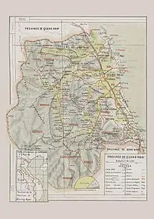 Quảng Ngãi's topography is dominated by a large plain along the coast and in the center of the province and by mountains and hills in the west and along its borders with Quảng Nam and Bình Định provinces. Lowlands extend further inland along Trà Khúc River.[8] The province's highest peak is at 1630m in the west of the province near the border to Quảng Nam.[9] The coastline is relatively straight in most of the south and central part of the province (unusual for the South Central Coast), but features several capes north of Quảng Ngãi City.[8] The province's largest river is the Trà Khúc. Other important rivers are the Trà Bồng in the north and the Ve River in the south of the province. The Lý Sơn islands belong to Quảng Ngãi.
