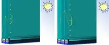 Solar irradiance heating of intermediate glass panes increases substantially with an increased number of glass panes.[1][9] Multipane glazing must be carefully designed to account for the expansion of the insulating gases that are placed between the glass layers, because such gaseous expansion becomes an increasingly important consideration as the number of glass panes is increased. Special breather vents, as well as small vents communicating between the layer spaces, can be incorporated in order to manage this glass-bulging effect.[10][1] Finite element analysis is often used to calculate appropriate glass sheets' strengths. Calculating static equilibrium with thin glass panes used in multipane glazing may involve nonlinear plate mechanics. [11]