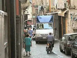 One of a network of busy, narrow streets that comprise the majority of thoroughfares traversing the historic Spanish Quarter of Naples.