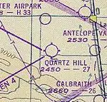 By 1982, the status of Quartz Hill had changed to a private field.[1] The airport was described as having two dirt runways: 2,550-foot (777 m) Runway 5/23 and 2,300-foot (701 m) Runway 9/27. It listed the operator as Antelope Valley Aeronautical.