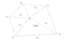 Let be an oriented polygon (with vertices counted countercyclically) in the plane with vertices and let be an arbitrary point not lying on the sides (or their extensions). Consider the triangulation of by the oriented triangles (the index is viewed modulo ). Associate with each of these triangles its circumcenter with weight equal to its oriented area (positive if its sequence of vertices is countercyclical; negative otherwise). The circumcenter of mass of is the center of mass of these weighted circumcenters. The result is independent of the choice of point .[3]