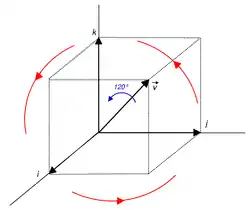 Consider the rotation f around the axis , with a rotation angle of 120°, or 2π/3 radians.