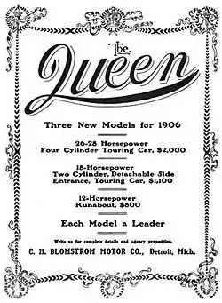 In 1904 the C.H. Blomstrom Motor Company was established and Blomstrom renamed his car the Queen. The Queen began as a runabout with a one-cylinder engine developing an impressive 8-hp. A double-opposed engine was also available and a four-cylinder was added for 1905 when the one-cylinder was dropped. During the summer of 1906 the firm was in trouble with the authorities, charged with having been “defectively incorporated."[2][1]