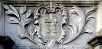 | Granville: Gules, three clarions or. For George Granville, 1st Baron Lansdowne of Bideford (1666-1735), nephew of John Granville, 1st Earl of Bath (1628–1701) and heir male of William Henry Granville, 3rd Earl of Bath (1692-1711).[45] It is the only escutcheon with heraldic supporters, generally reserved for use by nobility, here Two winged griffins rampant or. Above the escutcheon is a baron's coronet. He is identifiable by the style of his coronet and by his motto, shown inscribed on a scroll below: Deo, Patriae, Amicis[46] ("For God, my Country and Friends"), the motto of his uncle John Granville, 1st Earl of Bath having been: Futurum invisibile ("The future is unseen").[47] The arms are not those of John Granville, 1st Earl of Bath (1628–1701), or of his son Charles Granville, 2nd Earl of Bath (1661–1701). The latter's son William Granville, 3rd Earl of Bath (1692-1711) died aged only 19 two years before the building was completed in 1713. | ||||