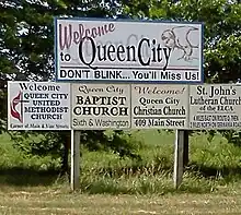 ![]() City limits sign, Queen City, Missouri. | |