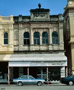 The Queen's Building is rendered on the street elevation and has classically influenced moulded decoration. The upper floor has four round headed windows with prominent voussoirs, separated by pilasters. Above this is an entablature and balustraded parapet. The central section is raised and has a tablet decorated by swags and topped by a draped urn. This conceals a hipped roof clad with corrugated iron. There are glass louvres fitted into the lower section of the windows. Early signage is visible on the entablature.[1]