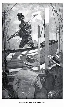 Although the son of a chief, he chose to leave his island out of curiosity to see more of the world and to experience and evaluate the civilization of the Christian world. At first rejected by the whaler that landed on his island, he skillfully jumped from a canoe and clamped to the side of the boat as it was leaving for the open sea, at which point the captain relented.[2] At the opening of the novel, he is in the port of New Bedford, Massachusetts, having returned from a whaling voyage. Queequeg and Ishmael first meet when Queequeg returns late to the inn where he is staying, not knowing that Ishmael has been booked into the same room with him. Although Queequeg initially threatens to kill Ishmael, and Ishmael initially is afraid of this cannibal, the latter soon decides "better sleep with a sober cannibal than a drunken Christian."[3] Upon waking next morning about daylight, Ishmael finds Queequeg's arm thrown over him in the "most loving and affectionate manner. You had almost thought I had been his wife."[4] Ishmael convinces Queequeg to ship on another whaling expedition with him. At the time of the novel, he has been away from his home island for many years, so long that it is possible that his father is dead and that he would become the chief if he returned.