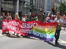 In the United Kingdom, the 1980s saw increased LGBT rights opposition from the right wing Conservative government led by Margaret Thatcher, who introduced Section 28 in 1988 in order to prevent what they saw as the "promotion" of homosexuality as an acceptable lifestyle in schools. However, the Conservatives' main opposition, the Labour Party, did little to address the issue of LGBT rights, ignoring calls from left-wingers such as Ken Livingstone, to do so.[68] Meanwhile, the popular right-wing press featured pejorative references to lesbians, supposedly especially associated with the all-female anti-nuclear protest camp at Greenham Common,[69] and individuals such as Peter Tatchell, the Labour candidate in the 1983 Bermondsey by-election. However, the growing commercialisation of the western gay subculture in the late 20th and early 21st centuries (the "pink pound") has come under heavy criticism from socialists. Hannah Dee remarked that it had reached "the point that London Pride – once a militant demonstration in commemoration of the Stonewall riots – has become a corporate-sponsored event far removed from any challenge to the ongoing injustices that we [the LGBT community] face."[70] At the same time, an anti-war coalition between Muslims (many organized through mosques) and the Socialist Workers Party led a leading member Lindsey German to reject the use of gay rights as a "shibboleth" that would automatically rule out such alliances.[71]