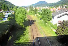Since 1994 the line has been split in the Deutsche Bahn timetable into two sections, east and west of Pirmasens Nord, the term Queichtalbahn is now mainly used for the eastern section from Landau to Pirmasens Nord,[3][4] while the western part is often called the Schwarzbachtalbahn (Schwarzbach Valley Railway)[5] as the line runs from Pirmasens Nord to Zweibrücken through the valley of the Schwarzbach.