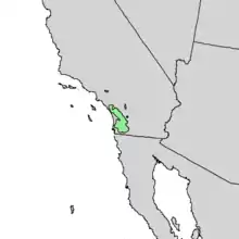 The Engelmann oak ranges from the foothills of the San Gabriel Mountains in eastern Los Angeles County through the Santa Ana Mountains of Orange County and the western foothills and mesas of the Peninsular Ranges in Riverside and San Diego counties, extending into the Sierra Juárez and Sierra de San Pedro Mártir ranges of northern Baja California. It is generally found in savannas and woodlands above the dry coastal plain, but below the 1,300 m (4,300 ft) elevation where colder winters prevail. The Engelmann oak has a smaller range than most California oaks, and suburban sprawl in the San Gabriel Valley has eliminated the oaks from most of the northern part of the range. The largest remaining stands of Engelmann oaks are on the Santa Rosa Plateau, near Murrieta in Riverside County, and on Black Mountain near Ramona in San Diego County.[2]