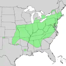 The species range extends from eastern Nebraska, south to Oklahoma (with an isolated population in Louisiana), east to northern Alabama and Georgia, northeast to New Hampshire, and in southeast Canada, extending as far north as the Carolinian forest zone of southern Ontario. It has a virtually disjunct (discontinuous) distribution, fairly common in New England and in the Appalachian Mountains, and also in the eastern Great Plains but rare in the Ohio Valley in between.[6]