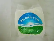 Kesong puti is a Filipino soft, unaged, white cheese made from unskimmed carabao milk and salt curdled with vinegar, citrus juices, or sometimes rennet. It can also be made with goat or cow milk. It has a mild salty and tart flavor. When an acidifying agent is used, it resembles queso blanco or paneer. When rennet is used, it resembles buffalo mozzarella. Moisture content can also vary, ranging from almost gelatinous to pressed and firm. It can be eaten as is, paired with bread (usually pandesal), or used in various dishes in Filipino cuisine. It is usually sold wrapped in banana leaves.[1]