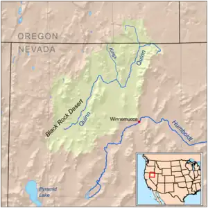 The Quinn River is the largest river in the region, starting in the Santa Rosa Range and ending in the Quinn River Sink on the playa south of the Black Rock Range. The watershed covers 11,600 sq mi (30,000 km2)[1] including the Upper and Lower Quinn River, Smoke Creek Desert, Massacre Lake, and Thousand Creek[3]/Virgin Valley[4] watersheds of northwestern Nevada as well as small parts across the borders of California and Oregon.