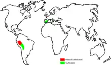 The plant thrives at high altitudes and produces seeds that are rich in protein.[9] Almost all production in the Andean region is done by small farms and associations. Its cultivation has spread to more than 70 countries, including Kenya, India, the United States and European countries.[10] As a result of increased popularity and consumption in North America, Europe, and Australasia, quinoa crop prices tripled between 2006 and 2014.[11][12]