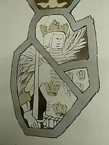 At some time during the 590s, Rædwald married a woman whose name is unknown, though it is known from Bede that she was pagan.[20] By her he fathered at least two sons, Rægenhere and Eorpwald. He also had an older son, Sigeberht, whose name is unlike other Wuffingas names but which is typical of the East Saxon dynasty. It has been suggested that Rædwald's queen had previously been married to a member of the Essex royal family and that Sigeberht was Rædwald's stepson, as was stated by William of Malmesbury in the 12th century.[21] Sigeberht earned the enmity of his step-father, who drove him into exile in Gaul, possibly to protect the Wuffingas bloodline.[22]