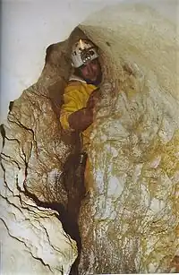 The downstream passages and the upstream passages and median networks were connected through the master cave, by the Grenoble Cavers of the French Alpine Club (SGCAF) in 2008, by pushing the boulder chokes, making it the second 1,000-metre (3,300 ft) deep system in the Vercors.[3]