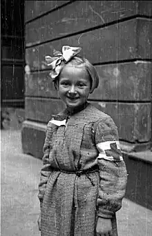 A photo of Goździewska, wearing a Red Cross armband, was taken in early August 1944 by Eugeniusz Lokajski, nom-de-guerre "Brok", a Home Army resistance fighter and photographer, who would perish a month later.[5][7] The Uprising, after incurring major casualties among the civilian participants, was eventually crushed by the Germans on 2 October.[2][3] Goździewska and her sister survived the war. Afterwards, she attended a gymnasium run by the Ursulines, graduated from the Silesian University of Technology, and in 1958, she emigrated to France, where she got married and had two children.[5][1] She died on 29 October 1989.[1]