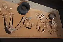 Ceramic grave offerings include pedestalled cups, globular cups, lugged cups, bowls, flasks, amphoras, jugs and basins. Limestone rings, stone axes, flint blades and animal bones also occur.