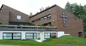Rødtvet Church is a church center in Oslo, Norway. There is a youth center, an elderly center, a kindergarten and offices. In addition to the church room, there are two congregation halls. The facades of the church building are in brick. On one of the exterior walls hangs a large ceramic cross, created by Konrad Galaaen.