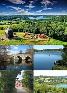 Windmill on Sobótka hill, Radunia stone bridge between Brodno lakes, Brodno Male lake, old village school, village view over Brodno Duze lake