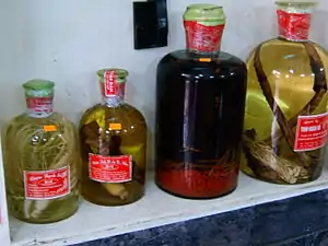 Rượu thuốc (lit. 'medicinal liquor') or rượu dân tộc (lit. 'traditional liquor') is a kind of Vietnamese distilled liquor (rượu) with herbs and medical animals, considered by traditional medicine as good for health. This drink consists of herbs or animals soaked in alcohol as a folk medicine cure for diseases in Vietnam. In Vietnam, rượu thuốc is widely believed to help drinkers improve their health and virility.[1]