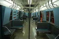 During the early 1970s, the R16s had their door motors replaced with door motors similar to those used by the R44s. As the replacement door motors were mounted in the walls rather than under the seats,[2] distinctive sloping wall panels (unique to the R16s) appeared.[3]