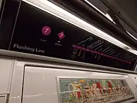 On June 10, 2016,[8] cars 7501–7928–7510 had their route signs modified with green circle/red diamond LED signs and a LED numbered-route display, similar to those on the R62A sets that were previously used on the 7, which are now on the 6. This modification was done to make it easier for passengers to differentiate between an express or a local train. In the following year, car 7501 had the LCD destination indicator parts of its destination signs replaced with LED panels to make it aesthetically similar to the aforementioned route display.[9] Cars 7505 and 7503 received the same modifications in mid-2019 and mid-2020, respectively. It is currently unknown if the remainder of the rolling stock will be retrofitted with these features.