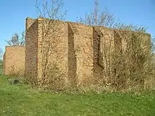 With the facility released from military control, the airfield stood intact yet disused for many years.[4] Eventually the hangars were removed, but the outline of the runways can still be seen in aerial photography. Test probing (2018) suggests the runways remain approximately 5 cm below the now grassed-over surface. Most of the perimeter track remains, mostly in a half-width condition, as do several of the derelict buildings, including the control tower.[18] A few of the Blister hangars remain and are used for farm storage. Most of the pillboxes also remain but, being largely subterranean, are filled in. The ammunition dumps, also derelict, remain.
