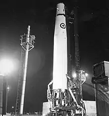 A Thor missile ready to launch, with its nuclear warhead replaced by a communications satellite payload