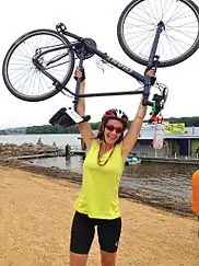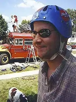 Ben Davidson, former professional football star player mainly with the Oakland Raiders, rode on RAGBRAI for several years, beginning in 1987.[72] Lance Armstrong rode the Wednesday and Thursday stages in 2006, speaking to a large throng of the riders in Newton. He then completed most of the 2007 ride before leaving a couple of days early to support Team Discovery's Alberto Contador and his Tour de France victory.[18] In 2008, Armstrong also made an appearance on the Ames, Iowa, leg of the trip. In 2011, 2013, 2014, 2017, and 2018, he again participated.[73][74][75] Ottumwa-born actor/comedian Tom Arnold has ridden a few RAGBRAIs, including XXIV in 1996.[76][77] Other participants have included three-time Tour de France champ Greg LeMond, columnist Dave Barry, NASCAR drivers Matt Kenseth and Jimmie Johnson, Motocross champion Ryan Dungey, 2004 Democratic presidential candidate Howard Dean and former Secretary of the Interior Bruce Babbitt.[78][79] Colorado governor and Democratic Presidential candidate John Hickenlooper rode in the 2019 ride. Hickenlooper, his spouse and his crew joined Team Skunk in Indianola where he provided a keg of his signature beer while using the shower of the host home.