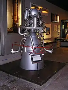 The RD-119 (GRAU Index 8D710) was a liquid rocket engine, burning liquid oxygen and UDMH in the gas-generator cycle.[3] It has a huge expansion ratio on the nozzle and uses a unique propellant combination to achieve an extremely high isp of 352 s for a semi-cryogenic gas-generator engine. It also has a unique steering mechanism. The engine main nozzle is fixed, and the output of the gas generator is fed into four nozzles on the side of the engine. Instead of using gimbaled verniers to supply vector control, the combustion gases are distributed by an electrically driven system that can control the thrust among the nozzles.