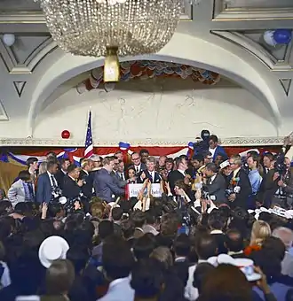 Kennedy went to work on the presidential campaign of his brother, John.[94] In contrast to his role in his brother's previous campaign eight years prior, Kennedy gave stump speeches throughout the primary season, gaining confidence as time went on.[95] His strategy "to win at any cost" led him to call on Franklin D. Roosevelt Jr. to attack Senator Hubert Humphrey as a draft dodger; Roosevelt eventually did make the statement that Humphrey avoided service.[96]