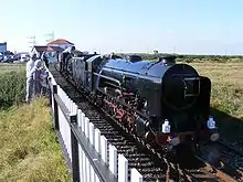 Howey was not satisfied with just 8+1⁄4 miles (13.3 km) of track from Hythe to New Romney and plans were in hand for an extension even before the original section had opened. The line was to be extended 5+1⁄2 miles (9 km) from New Romney to Dungeness, double-tracked throughout apart from a balloon loop on which the station at Dungeness was sited. A Light Railway Order for this extension was applied for and, following a Public Inquiry on 18 April 1928, the Romney, Hythe & Dymchurch Light Railway (Extension) Order was granted on 12 July 1928. Ahead of this the line between New Romney and The Pilot had actually opened on 24 May 1928 and the rest of the line through to Dungeness opened on 3 August 1928.[8] Since it was laid directly onto the shingle forming the Dungeness peninsula it has been suggested that the extension was the most cheaply constructed railway in the world.[9]