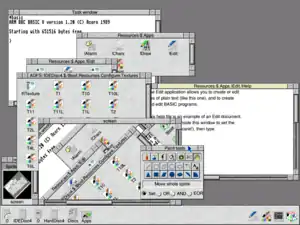 The WIMP interface is based on a stacking window manager and incorporates three mouse buttons[64] (named Select, Menu and Adjust), context-sensitive menus, window order control (i.e. send to back) and dynamic window focus (a window can have input focus at any position on the stack). The icon bar (Dock) holds icons which represent mounted disc drives, RAM discs, running applications, system utilities and docked: files, directories or inactive applications. These icons have context-sensitive menus and support drag-and-drop operation. They represent the running application as a whole, irrespective of whether it has open windows.