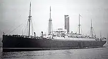 When the United Kingdom entered World War I in August 1914, Saxonia was requisitioned for government service and taken off her Trieste-Boston route. She made a single voyage as a troopship, carrying troops from the 41st Battalion of the Canadian Expeditionary Force, arriving in England on 28 October 1914.[8] In 1915 she was tied up in England on the River Thames as an accommodation ship for German prisoners of war. In March 1915, she resumed service as a troopship.[2][7][9]