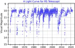 RS Tel has a maximum magnitude of 9.6 and a minimum magnitude 16.5.[15] The star undergoes large, random variations in brightness on a time scale of thousands of days with no apparent periodicity.[16] The star is surrounded by a circumstellar shell of dust which radiating an infrared excess.[16]