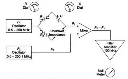 The two variable frequency oscillators track each other at frequencies 100 kHz apart. The output of a 0.5-250 MHz oscillator,[1] F1, is fed into a bridge. When the impedance network to be measured is connected one arm across the bridge, the equivalent parallel resistance and reactance (capacitive or inductive) unbalances the bridge and the resulting voltage is fed to the mixer. The output of the 0.6-250.1 MHz oscillator F2, tracking 100 kHz above F1, is also fed to the mixer. This results in a 100 kHz difference frequency proportional in level to the bridge unbalance. The difference frequency signal is amplified by a filter amplifier combination and is applied to a null meter. When the bridge resistive and reactive controls are nulled, their respective dials accurately indicate the parallel impedance components of the network under test.