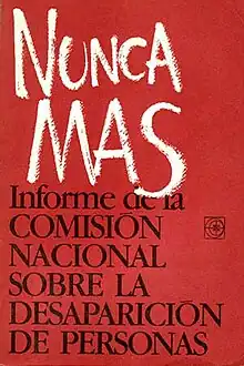The first priority of Raúl Alfonsín was to consolidate democracy, incorporate the armed forces into their standard role in a civilian government, and prevent further military coups.[24] Alfonsín first tried to reduce the political power of the military with budget cuts, reductions of military personnel and changing their political tasks.[25] As for the crimes committed during the Dirty War, Alfonsín was willing to respect the command responsibility and accept the "superior orders" defense for the military of lower ranks, as long as the Junta leaders were sentenced under military justice. This project was resisted by human rights organizations such as Mothers of the Plaza de Mayo and public opinion,[26] as it was expected that the defendants would be acquitted or receive low sentences.[20] The military considered that the Dirty War was a legally sanctioned war, and considered the prosecutions to be unjustified.[20] Alfonsín also established the National Commission on the Disappearance of Persons (CONADEP), composed of several well-known personalities, to document cases of forced disappearances, human rights violations and abduction of children.[18] Alfonsín sent a military code bill to Congress so that the military would use it. In its "Nunca más" report (Spanish: Never again), the CONADEP revealed the wide scope of the crimes committed during the Dirty War, and how the Supreme Council of the military had supported the military's actions against the guerrillas.[27]