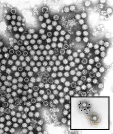 Rabbit hemorrhagic disease virus (RHDV) is a virus in the genus Lagovirus and the family Caliciviridae. It is a nonenveloped virus with a diameter around 35–40 nm, icosahedral symmetry, and a linear positive-sense RNA genome of 6.4–8.5 kb. RHDV causes a generalized infection in rabbits that is characterized by liver necrosis, disseminated intravascular coagulation, and rapid death. Division into serotypes has been defined by a lack of cross-neutralization using specific antisera.[5] Rabbit lagoviruses also include related caliciviruses such as European brown hare syndrome virus.[6]